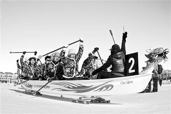 2月2日,內蒙古錫林浩特市錫林湖冰場,中外選手在冰上龍舟100米直道賽中激烈角逐。當日,五大洲冰上龍舟挑戰賽在此舉行,來自全球21個國家和地區的近600名運動員參賽,賽事融合冰雪運動與傳統文化,助力當地冰雪經濟發展。視覺中國 供圖