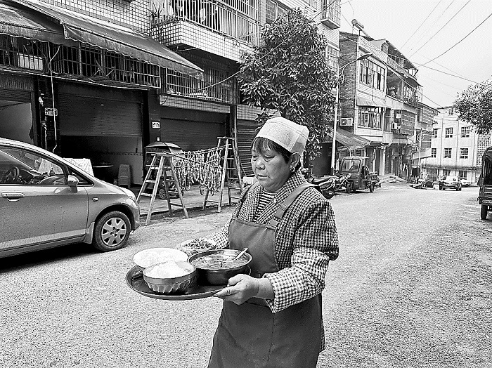 每天開飯前,大橋飯店員工肖木容都要去給附近兩位行動(dòng)不便的老人送飯。