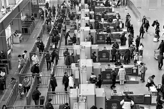 2月2日春運首日,南京南站,旅客們有序安檢進站。