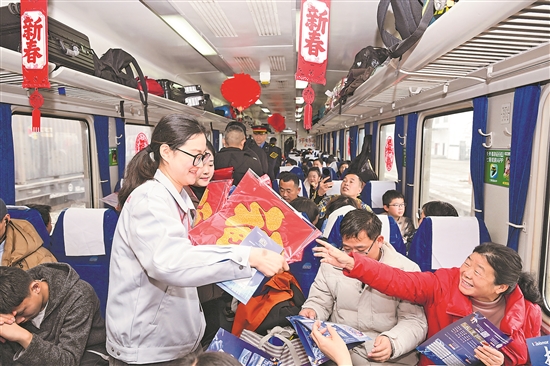 2月5日,由中國鐵路上海局集團有限公司合肥客運段聯合合肥市人社局舉辦的列車招聘會在上海站開往阜陽站的K8362次列車上舉行,為返鄉游子架起就業對接的橋梁。新華社記者 杜宇 攝