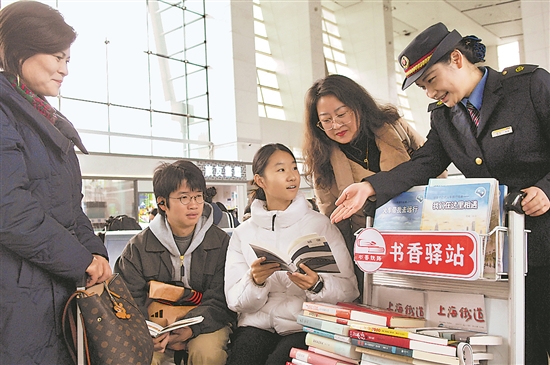 春運期間,中國鐵路上海局集團有限公司鎮江站迎來了返鄉過年的客流,車站因地制宜推出綠色通道、免費充電、解答問詢、便捷換乘引導、關愛重點旅客等服務措施,為旅客送上暖心服務。圖為在“潤之舟”雷鋒服務站工作人員為旅客送上精美圖書,增加“文化充電”,在旅途中靜心閱讀,充滿濃濃的書馨。