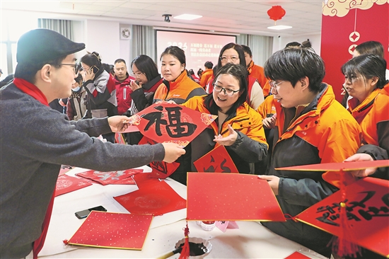 2月8日,在南京市江寧區江蘇圓通速遞公司舉辦的專場活動上,書法家們為新就業形態勞動者手寫“?!弊趾痛郝摗?/p>