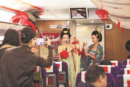 2月9日,在G848次列車上,敦煌研究院敦煌藝術館工作人員向旅客講解傳統文化知識。