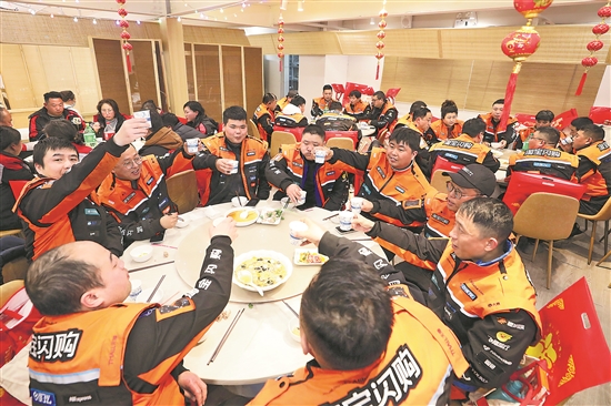 2月10日,江蘇省南京市秦淮區的一家騎手友好餐廳暖意涌動,周邊外賣、快遞小哥結束送單陸續趕來,共赴家宴。當日,由秦淮區總工會主辦的秦淮區春節留寧新就業群體“暖新”年夜飯活動舉行。現場設置了幸運抽獎、暖心大禮包發放等環節,讓留寧過年的勞動者在異鄉也能感受到家的溫暖。本報記者 劉金夢 攝