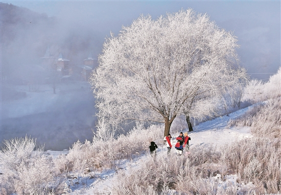 2月7日,游客在黑龍江省哈爾濱市西泉眼水庫的霧凇美景中留影。 新華社發(張樹 攝)